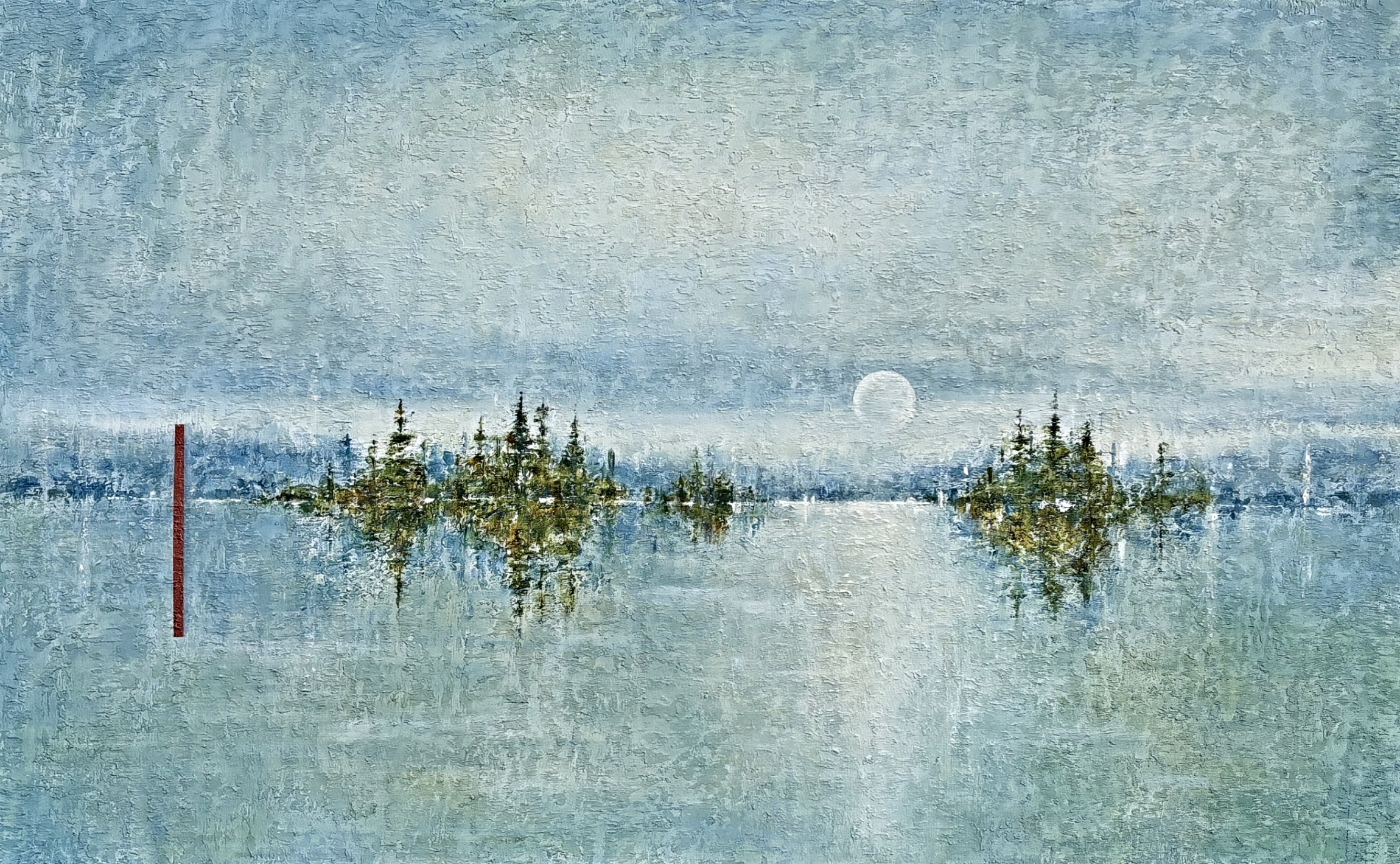 Original acrylic landscape painting of a full moon over a lake with a copper accent line by Canadian artist Gina Sarro.