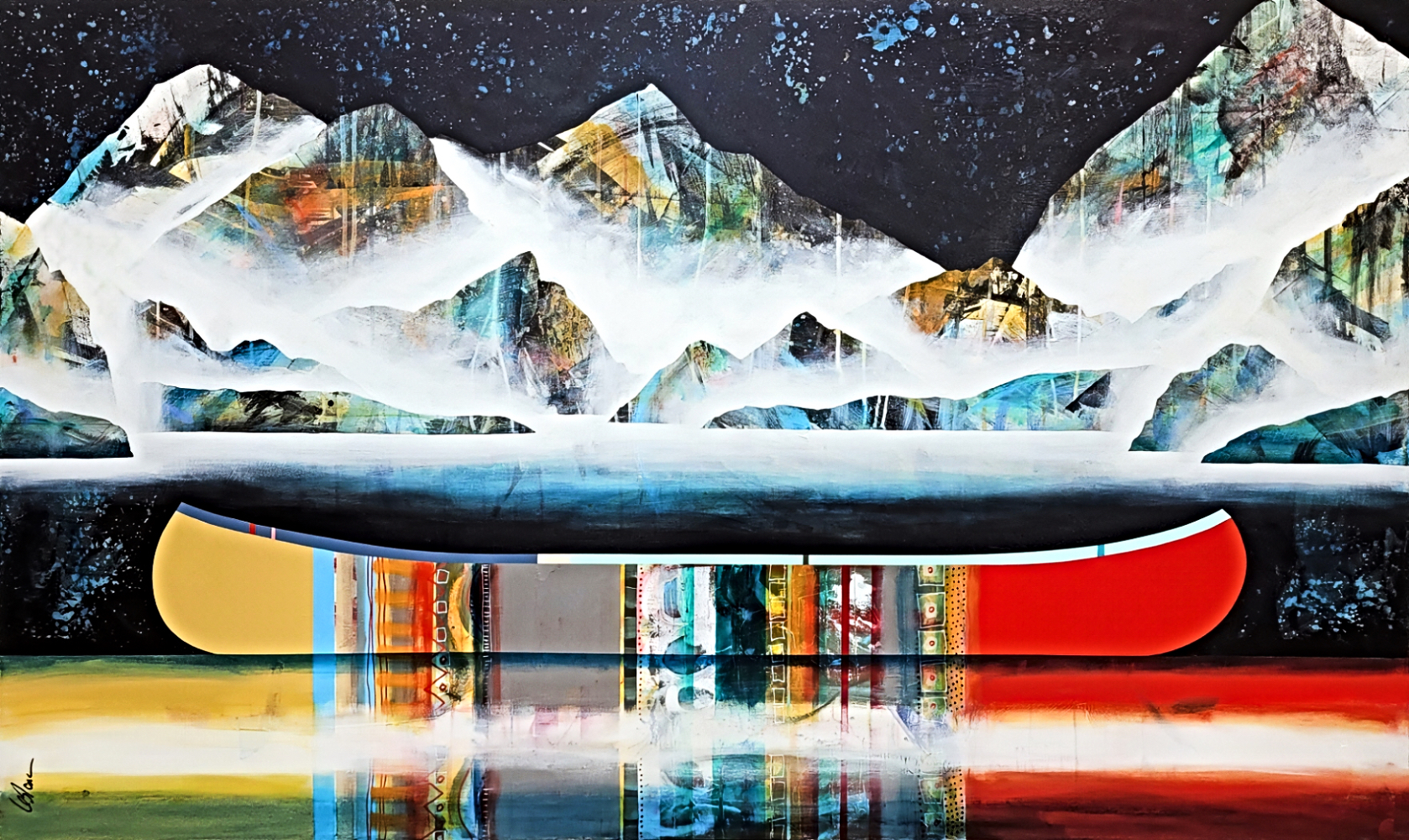 Original mixed media canoe and mountain painting by Canadian artist Sylvain Leblanc.