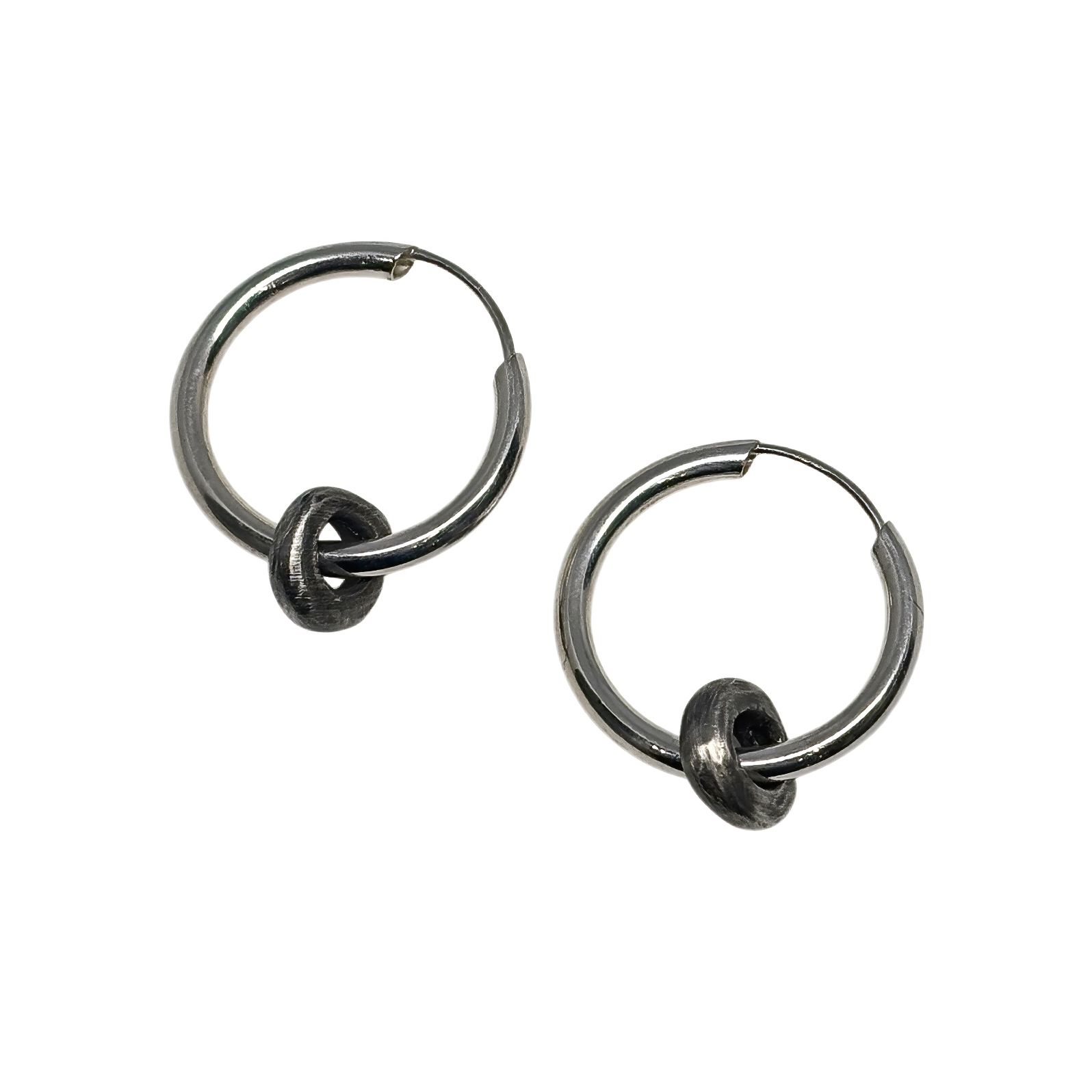 Handmade sterling silver hoop earrings with removable oxidized silver charm by Canadian jewelry artist Karyn Chopik.